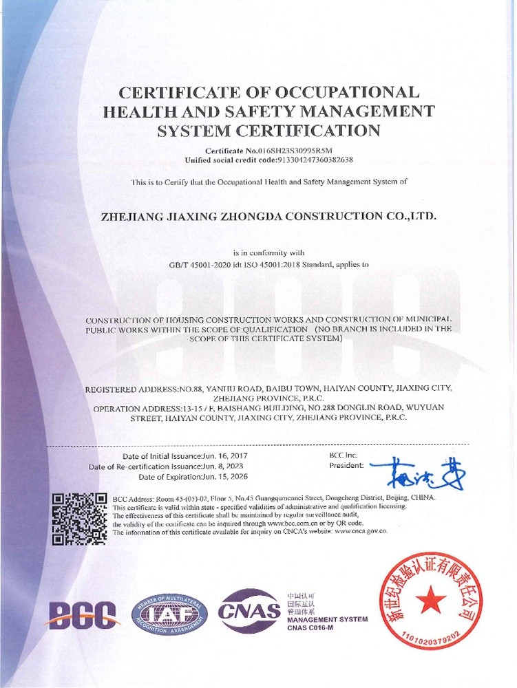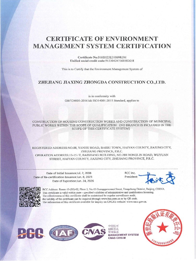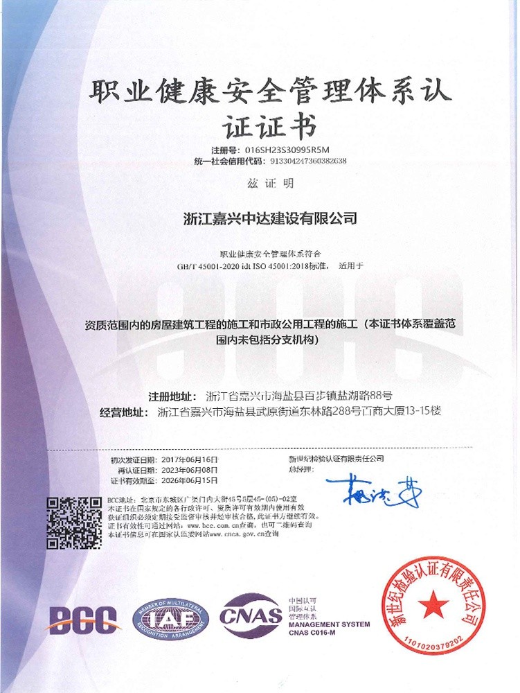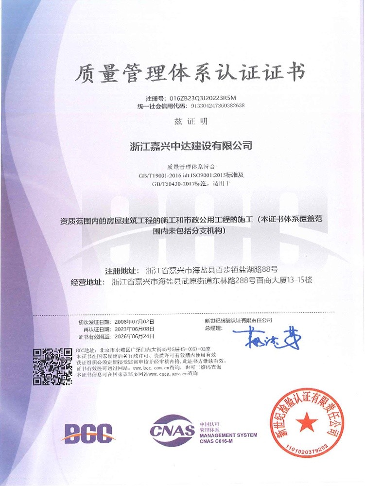 公司始終堅持“質(zhì)量為本、規(guī)范施工、遵紀(jì)守法、持續(xù)改進”的管理方針,全面實施ISO9001、GB/T50430質(zhì)量、ISO14001環(huán)境和GB/T 28001職業(yè)健康安全體系標(biāo)準(zhǔn),提高現(xiàn)場質(zhì)量、安全生產(chǎn)、文明施工管理水平,積極推進創(chuàng)優(yōu)奪杯活動,努力打造一流品質(zhì)工程,先后獲得了浙江省建筑安全文明施工標(biāo)準(zhǔn)化工地、浙江省智慧工地示范項目、嘉興市“南湖杯”優(yōu)質(zhì)工程、嘉興市建筑安全文明施工標(biāo)準(zhǔn)化工地等諸多工程榮譽。公司成立了嘉興市建筑企業(yè)技術(shù)中心,參編國家級行業(yè)標(biāo)準(zhǔn)、省級行業(yè)標(biāo)準(zhǔn),取得省級工法、發(fā)明專利、實用新型專利40余項。