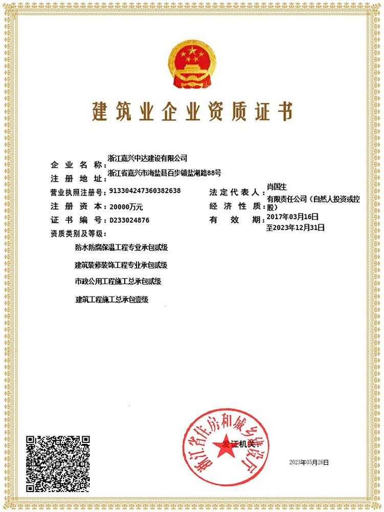 中達(dá)建設(shè)是中達(dá)集團旗下子公司之一,辦公地址為海鹽縣武原街道東林路288號。公司具有國家房屋建筑工程施工總承包壹級、市政公用工程施工總承包貳級、建筑裝修裝飾工程專業(yè)承包貳級、防水防腐保溫工程專業(yè)承包貳級、機電工程施工總承包叁級等資質(zhì)。在逐年提升本土市場份額的同時,公司積極開拓市外、省外市場,目前已在十余個省市區(qū)域設(shè)立分公司,業(yè)務(wù)范圍遍布浙江、上海、江蘇、湖北、江西等地。