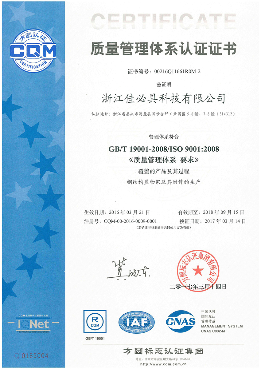 公司歷經二十余年不斷開拓進取,在貨架及倉儲物流設備和塔內件裝備領域建立了獨特的競爭優(yōu)勢,在業(yè)界樹立了良好的聲譽,并擁有“HOMUST佳必具”和“中達智能倉儲”兩大自主品牌。公司通過了質量、環(huán)境、職業(yè)健康安全管理體系認證,以及歐盟CE、美國NSF、FSC、BSCI、SMETA、SEDEX和FCCA等認證。