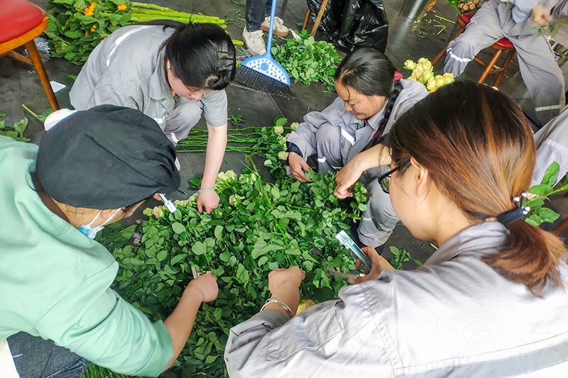 5月9日,花材如期而至。從云南空運過來的花材,經(jīng)過了2-3天的長途跋涉,均處在脫水的狀態(tài),園藝社的小伙伴們在插花老師的指導下,一起對花材進行整理、醒花、養(yǎng)花。