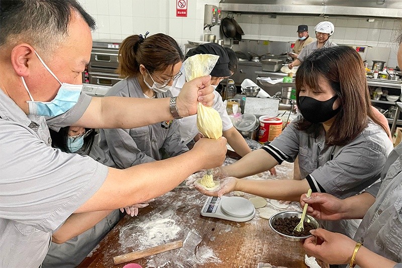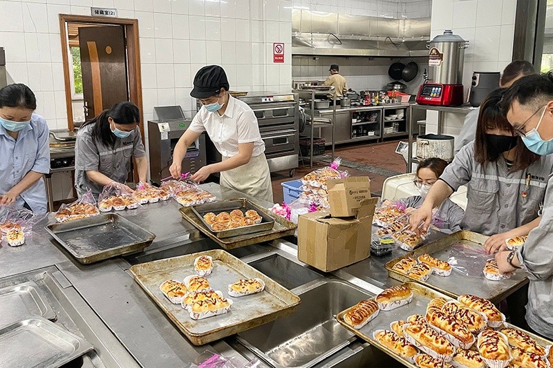 5月12日清晨,工作人員就開始做面包、雪媚娘、水果拼盤等等,恒洋熱電總工屠國華更是化身“奶油小生”,專職從事“需要力量的擠奶油”工作。園藝社的社員們也早早來到活動現(xiàn)場,準備精致可愛的花籃。