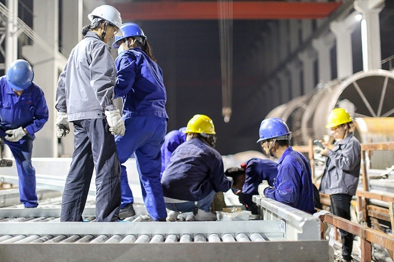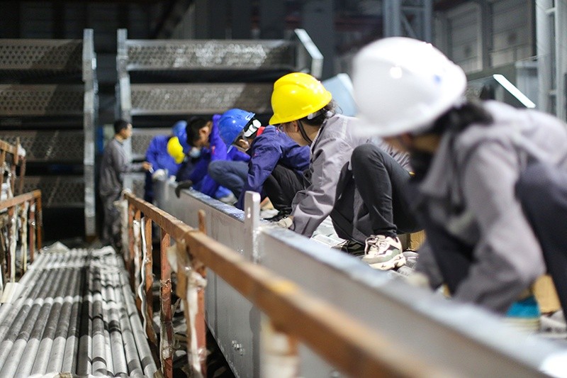 5月28日晚,第一、二兩組穿管人員全部就位,按照安全生產(chǎn)的著裝要求,戴好安全帽和防護(hù)手套,統(tǒng)一聽從指揮。“好了沒?”“好了!”“三、二、一,抬!”整齊劃一的口號劃過,一根長10米足足有手臂粗的鋼管穩(wěn)穩(wěn)地穿進(jìn)了管束孔,固定在了架子上。第一根管子的成功就位,對于從來沒有在一線操作過的行政人員充滿了信心。四個小時的時光流逝,汗水滴落,第一晚120根管子全部完成。此刻的大家,全身酸脹衣衫盡濕,但看到同心協(xié)力的成果,臉上無不露出開心的笑容。