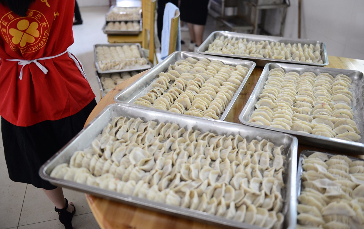 在食堂大廳,大家布置現(xiàn)場(chǎng),洗菜,準(zhǔn)備肉料……經(jīng)黨員、志愿者們1個(gè)小時(shí)的努力,一盤(pán)盤(pán)的餃子精心制作完成,準(zhǔn)備下鍋。隨著一碗碗熱騰騰的餃子端上圓桌,老人們紛紛前往品嘗,食堂大廳充滿愉悅聲與贊許聲。