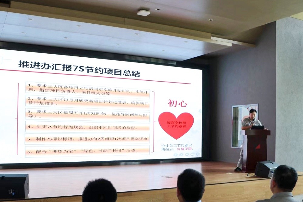隨后,7S節(jié)約管理項目三大區(qū)負責(zé)人分別匯報了半年來的工作開展情況和經(jīng)驗總結(jié),并分享了后期持續(xù)實施的計劃等。7S節(jié)約管理項目顧問胡光相從宏觀層面分析當(dāng)前形勢作引入點,闡述了推行7S的必要性,并鼓勵大家堅定信心和決定,用實際行動繼續(xù)落實7S管理。