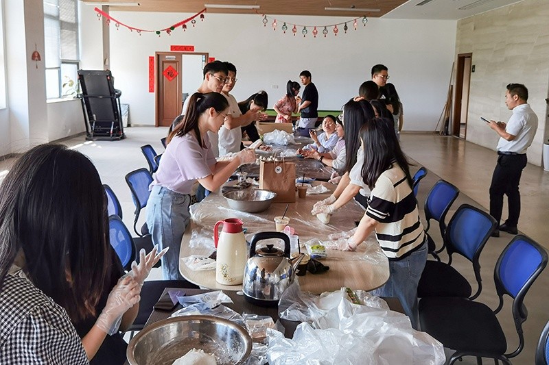在自制冰皮月餅的活動現(xiàn)場,大家迫不及待親自動手,“揉、壓、包、印”大家相互探討、互相分享各自的制作方法和技巧,其樂融融。雖然大家都是第一次動手做月餅,但都興致盎然,使整個(gè)活動現(xiàn)場熱鬧非凡。