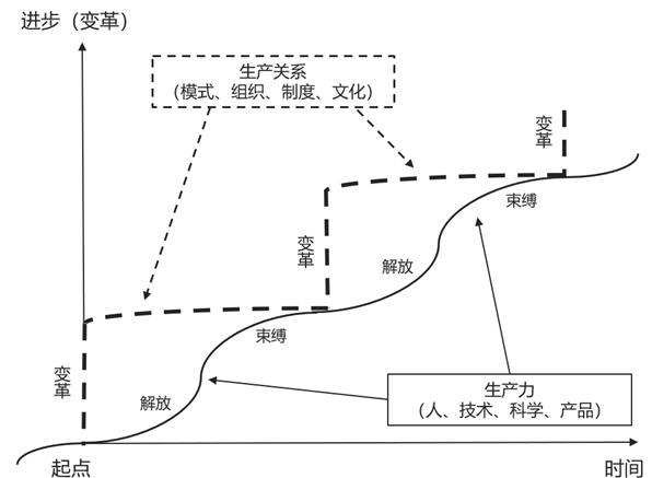 生產(chǎn)力是推動(dòng)社會(huì)發(fā)展的主要?jiǎng)恿?,持續(xù)不斷的發(fā)展,直到生產(chǎn)關(guān)系開始束縛生產(chǎn)力的發(fā)展,使其進(jìn)步緩慢。但生產(chǎn)力的發(fā)展是不可阻擋的,所以終將突破枷鎖,也就是說,生產(chǎn)關(guān)系將發(fā)生一次變革,建立一種不束縛生產(chǎn)力發(fā)展的關(guān)系。每次一次變革后,生產(chǎn)力會(huì)得到解放,逐步恢復(fù)發(fā)展速度,直到下一次束縛的到來。