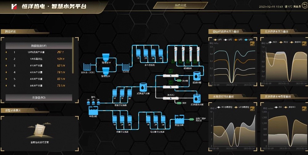 在水處理工藝上由化學(xué)除鹽提升改造物理除鹽,建立了智慧水務(wù)管控平臺(tái),完成對(duì)水處理系統(tǒng)的自動(dòng)化及物聯(lián)網(wǎng)智能化的改造建設(shè)。工藝流程直觀呈現(xiàn),運(yùn)行參數(shù)實(shí)時(shí)展示;趨勢(shì)報(bào)警預(yù)警,診斷分析,實(shí)現(xiàn)精細(xì)化管理;優(yōu)化運(yùn)行參數(shù)、優(yōu)化設(shè)備運(yùn)行效率。平臺(tái)實(shí)施應(yīng)用后,節(jié)約運(yùn)行成本近20%,節(jié)約用工成本近60%。