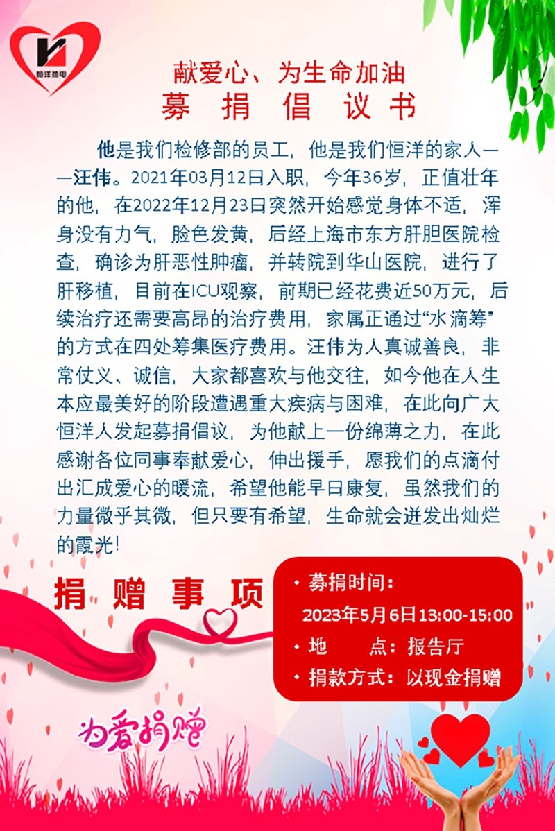 病魔無(wú)情人有情,“一人有難,八方支援”向來(lái)是中華民族的傳統(tǒng)美德。恒洋熱電工會(huì)在獲悉情況后,立即向全體員工發(fā)出了“愛(ài)心捐款倡議書”,希望大家獻(xiàn)一份愛(ài)心、盡一份力量,伸出援助之手,用愛(ài)心托起生命的希望。